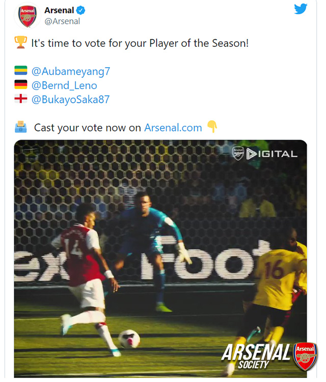 อาร์เซน่อล เผยรายชื่อ 3 นักเตะที่เข้าชิงรางวัลนักเตะยอดเยี่ยมแห่งฤดูกาลของสโมสร ได้แก่ ปิแอร์-เอเมอริค โอบาเมยอง กองหน้ากาบอง, บูกาโย่ ซาก้า กองกลางดาวรุ่ง และ แบรนด์ เลโน่ ผู้รักษาประตูจอมหนึบ